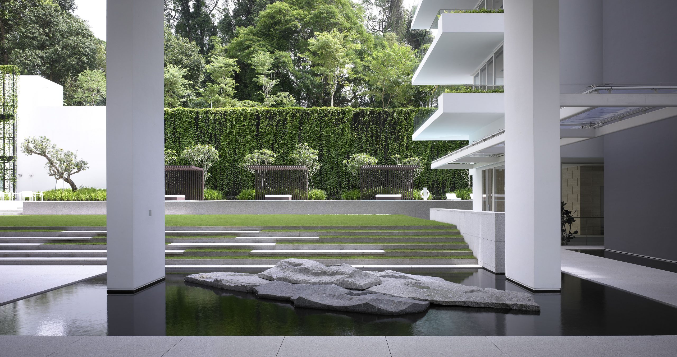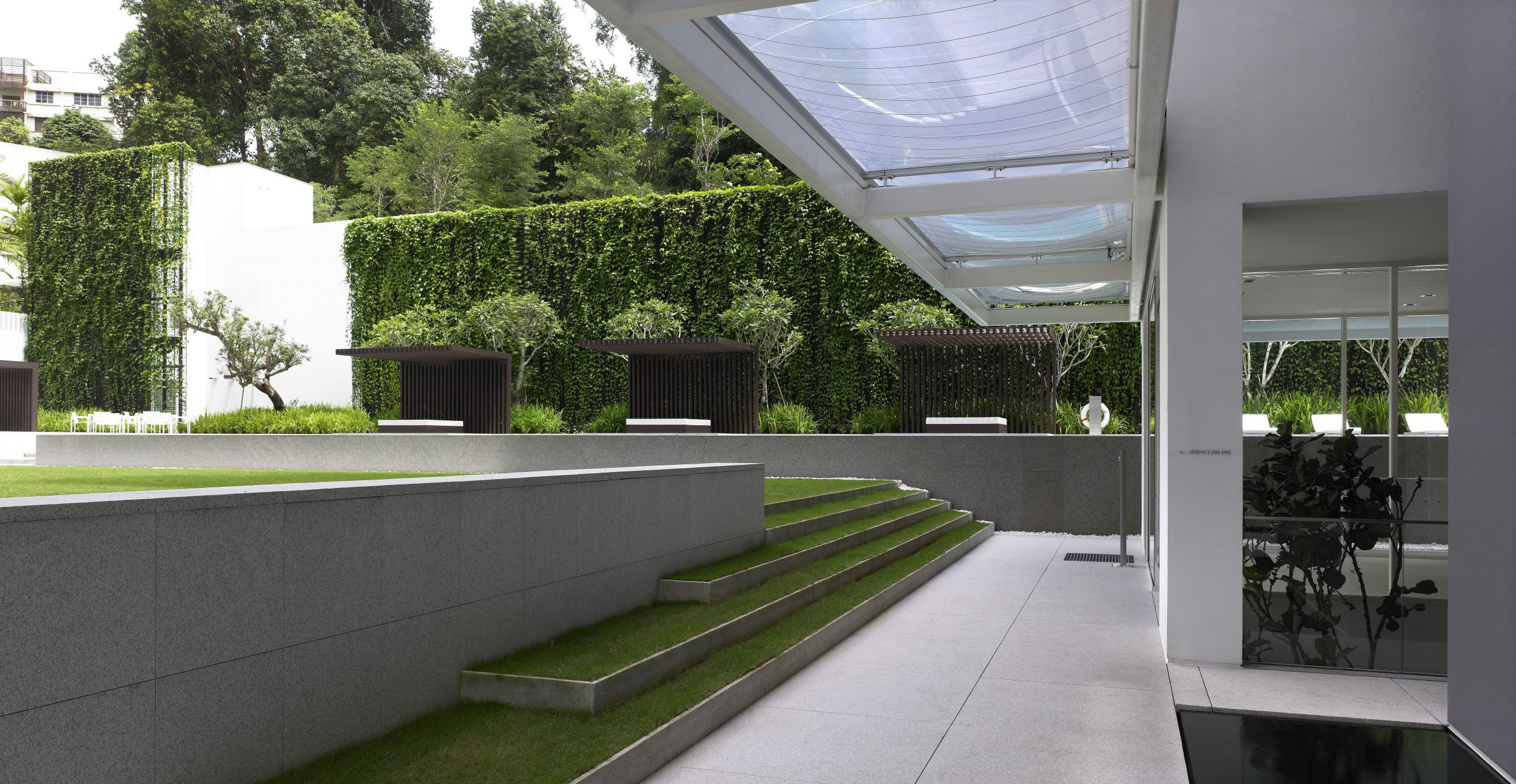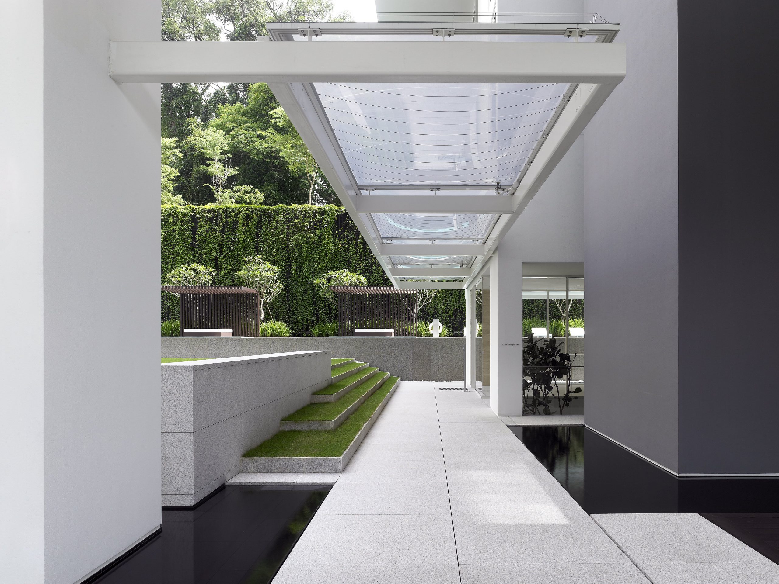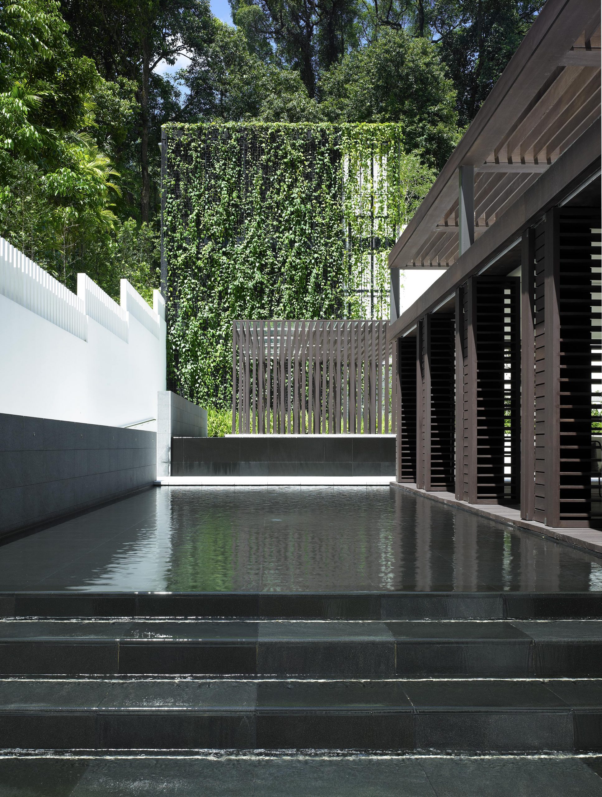 The landscape design of 8 Napier responds to the steep slope of the property. A seven to eleven metre high wall rises to the north of the site. To the west is a hospital and to the east, a condominium. The design minimises views to these neighbouring properties. Stepped terraces express specific functions. Three mature Syzigium trees announce the entrance to the first terrace forecourt and porte cochere.