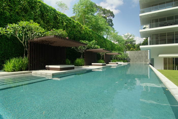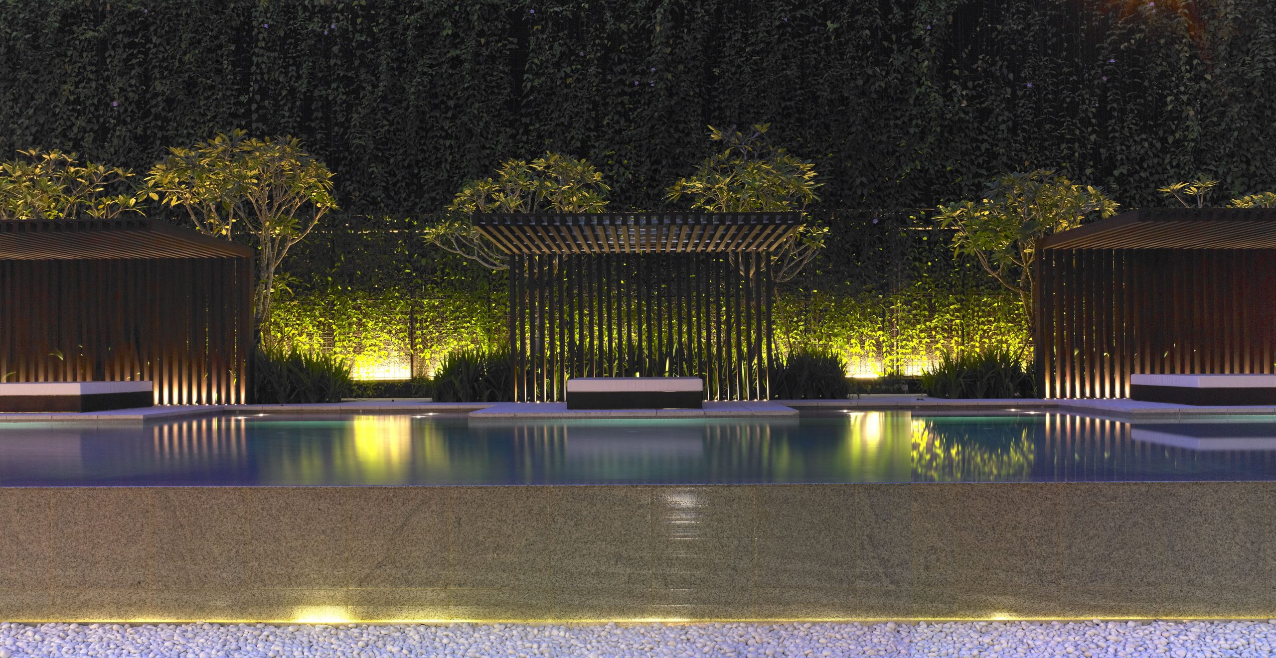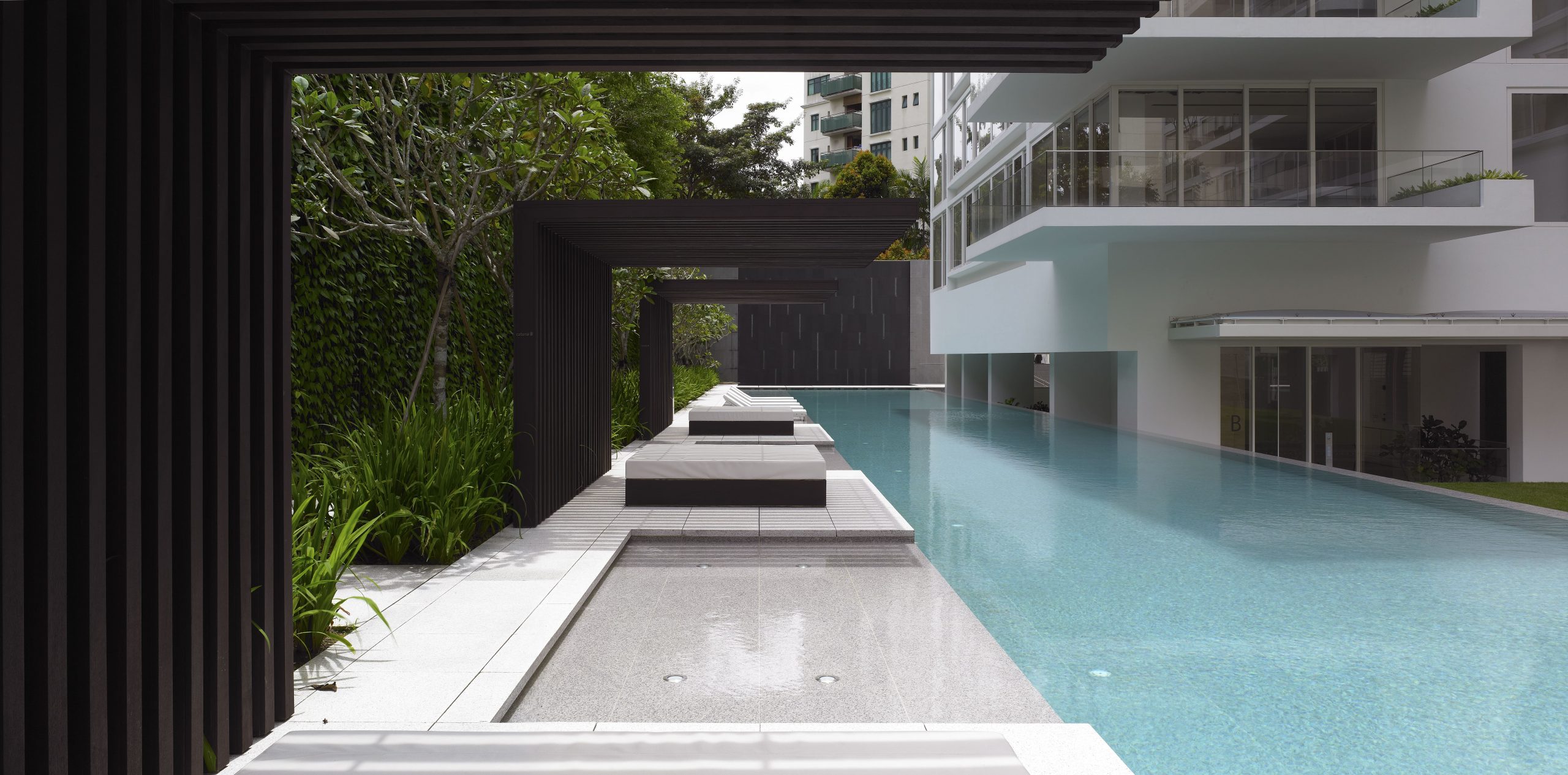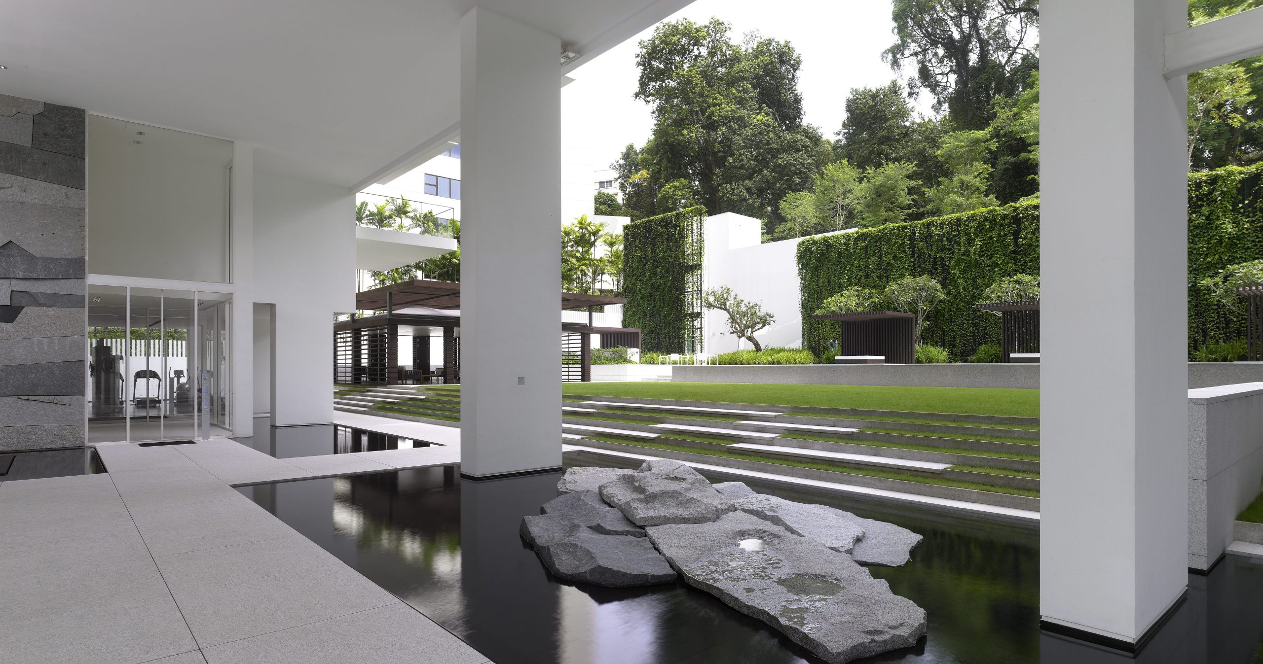 The landscape design of 8 Napier responds to the steep slope of the property. A seven to eleven metre high wall rises to the north of the site. To the west is a hospital and to the east, a condominium. The design minimises views to these neighbouring properties. Stepped terraces express specific functions. Three mature Syzigium trees announce the entrance to the first terrace forecourt and porte cochere.