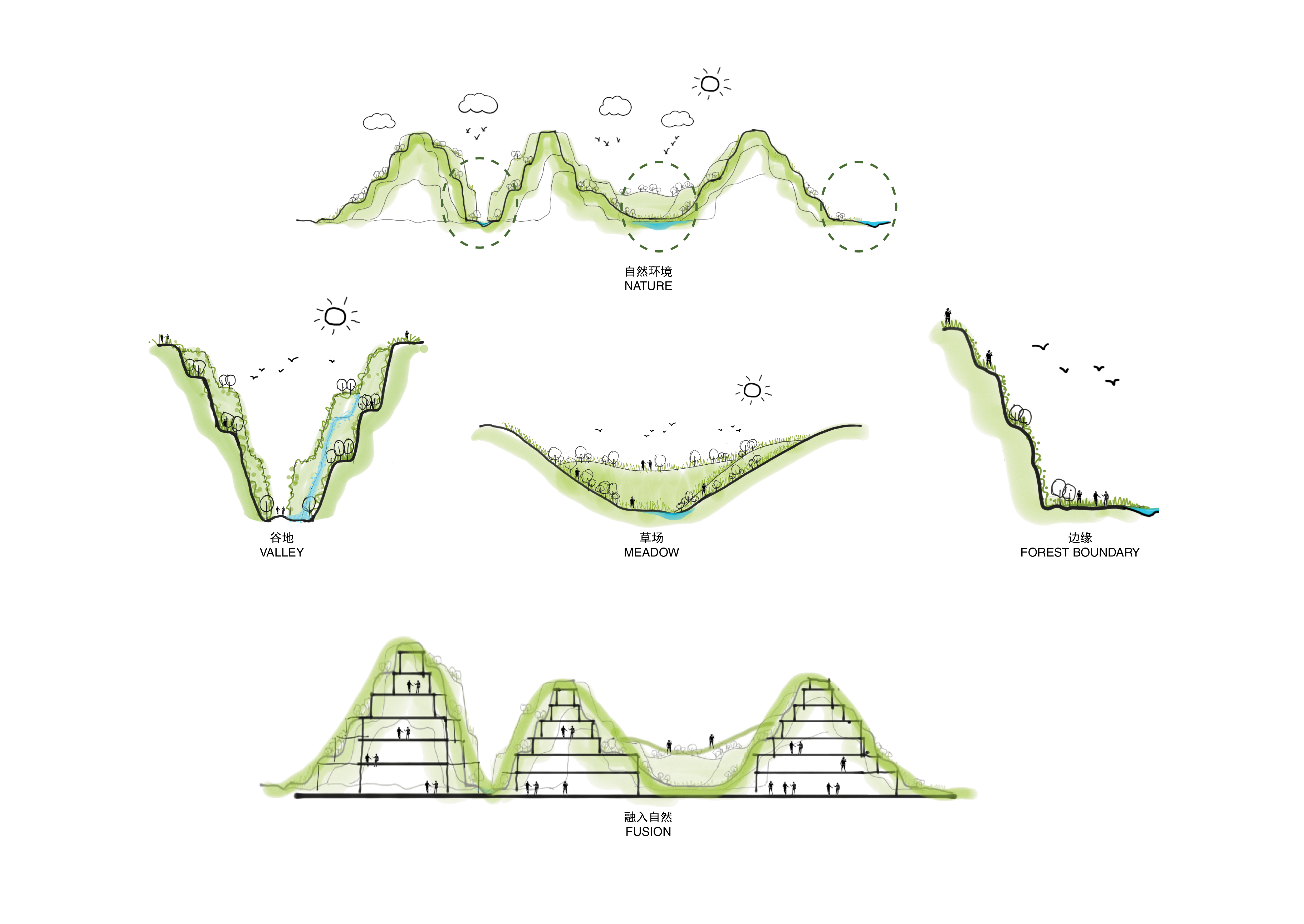 Tierra introduces the “Urban Nature” landscape concept to shape a distinctive urban green space inspired by the character of Qiantan Park and the Huangpu River. Here, the boundary between the urban and the wild softens and blurs, allowing both realms to overlap and evolve naturally with the changing seasons. Lush planting unfolds in an ever-changing tapestry of colour, offering fresh vistas throughout the year. The site becomes a microcosm of nature, grounded by textured granite paving laid in a distinctive pattern that anchors the landscape experience. Pedestrian movement flows through the space like a meandering stream, weaving across open-air valleys framed by cascading greenery. After rainfall, small puddles momentarily gather along the paving, quietly receding with time. The project serves as an urban oasis, reconnecting people with nature amidst the surrounding metropolitan fabric.